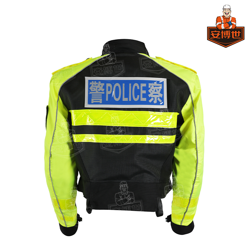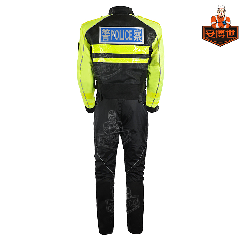 上衣前胸,左手臂及后背均配有反光标贴及臂章的魔术贴,以及对讲机的挂袢。上衣的下摆处配有四条腰带的挂袢。上衣及裤子均设有大面料反光滚边条,以提升夜间的行车安全。上衣下摆及裤子腰部均设有魔术贴可调节带。 内胆可以拆除单穿。