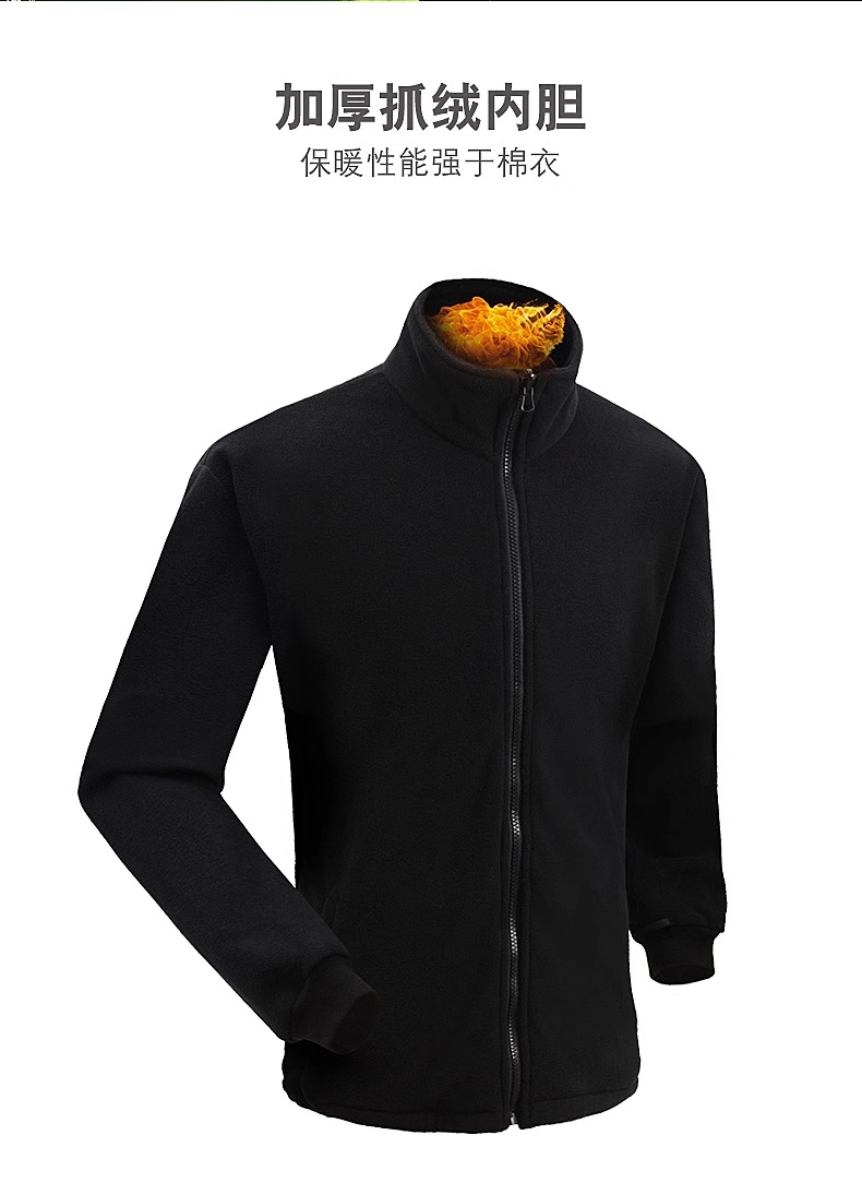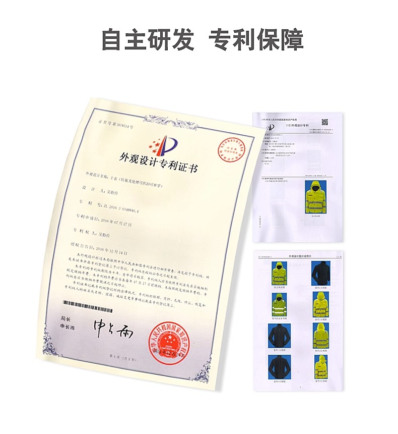 采用美国杜邦公司特氟龙处理技术,可有效防污、防油、防水;可拆卸反光夹克,内胆摇粒绒可日常穿着,厚度达 280g;外套口袋防水拉链可防止雨水进入口袋;防风防水防雪;防雨雨帽可折叠放入后领中;可挂对讲机、胸牌、臂章